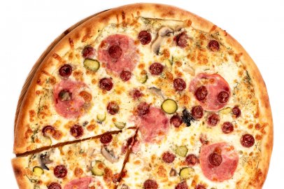 Курица, Помидоры, Ветчина, Лук красный, Моцарелла, Охотничьи колбаски, Фарш говяжий, Перец халапеньо, Томатный соус, Тесто на итальянской муке,