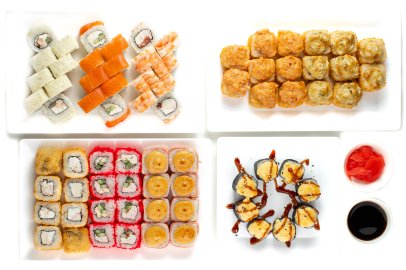 Васаби 1шт, имбирь 1шт, соевый соус 2шт, Алоха, Классика курица с тобикой, Запеченный краб, Запеченный Фьюжн,